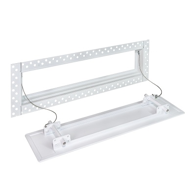 Данная решетка подходит для монтажа на любую поверхность под финишную отделку. Рамка и экран изготовлены из алюминия, опора экрана - из оцинкованной стали. Рама оснащена «полкой» 1,9 мм и рифлеными краями для большей адгезии финишного материала – шпатлевки, цемента. Решетка имеет съемную центральную часть с фиксированным углом наклона ламелей 15°. Она крепится к корпусу прочными металлическими тросиками, легко снимается для очистки и удобного обслуживания.