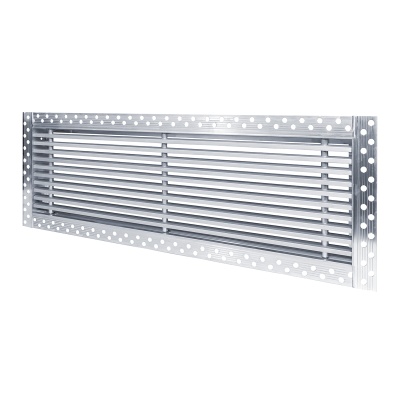 Данная решетка подходит для монтажа на любую поверхность под финишную отделку. Рамка и экран изготовлены из алюминия, опора экрана - из оцинкованной стали. Рама оснащена «полкой» 1,9 мм и рифлеными краями для большей адгезии финишного материала – шпатлевки, цемента. Решетка имеет съемную центральную часть с фиксированным углом наклона ламелей 15°. Она крепится к корпусу прочными металлическими тросиками, легко снимается для очистки и удобного обслуживания.