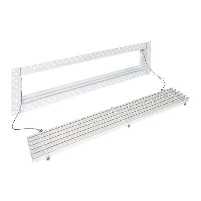 Данная решетка подходит для монтажа на любую поверхность под финишную отделку. Рамка и экран изготовлены из алюминия, опора экрана - из оцинкованной стали. Рама оснащена «полкой» 1,9 мм и рифлеными краями для большей адгезии финишного материала – шпатлевки, цемента. Решетка имеет съемную центральную часть с фиксированным углом наклона ламелей 15°. Она крепится к корпусу прочными металлическими тросиками, легко снимается для очистки и удобного обслуживания.